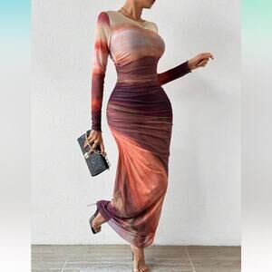 2025 Long Sleeve Maxi Dress Bodycon Ruched Natural Slim Fit TieDye Dress M