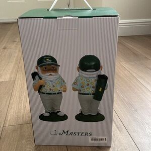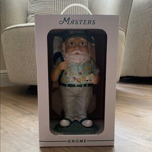 Charming Masters golf gnome figurine. Features a colorful shirt and classic golf attire. Perfect for golf enthusiasts.