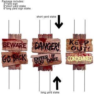 【Package】3 signs + 12 plasticl stakes , package included some scary warning messages such as"BEWARE. GO BACK","KEEP OUT !CONDEMNED"and "DANGER!ENTER IF YOU DARE" .3 spooky bloody warning signs with the spookiest design make a horror spooky scene at your Halloween night