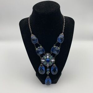 Be the belle of the ball in this stunning moonlit sapphire drop necklace. Gleaming hematite tone is set with a resplendent group of crystals in all hues of montana blue, sapphire blue and green. Adjustable from 16" to 19" length.