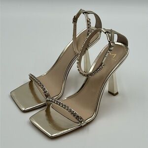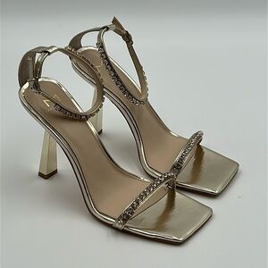Glamorous metallic finish with rhinestone-embellished ankle and toe straps. Features a square toe and a chic block heel for style and stability.