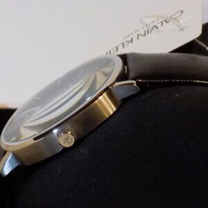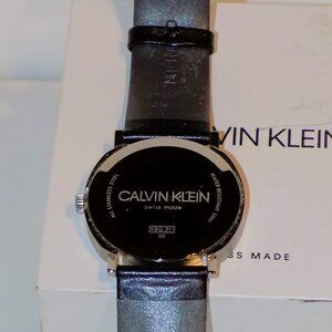 Comes with case, tag, & manual. Tag on side of case has $209 price. 40 x 9mm case. 20mm wide black smooth band has "Calvin Klein" & "W01X" embossed on underside. Back of case reads: Calvin Klein, Swiss Made, K8Q 311, Water resistant 3bar, All Stainless Steel. Logo on crown. I installed a new battery & watch is keeping time, 'Calvin Klein" on buckle. Back of mirror finish case has surface scratches. Luminescent sections on hour & minute hands. Crystal glass is in great condition.