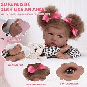 * Realistic baby dolls girl:When you meet this adorable african american baby doll girl, you will be charmed by her irresistible charm. Crafted by professional artists, she bears a striking resemblance to a real baby with meticulously hand-rootted black curly hair, taupe eyes, hand-applied eyelashes, and realistic skin texture. Holding the real looking baby dolls evoke the sensation of holding a real baby dolls that look real.