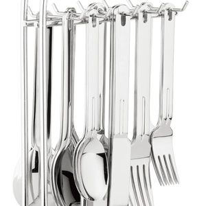 Includes: 4-Piece Dinner Spoon, 4-Piece Dinner Fork, 4-Piece Dinner Knife, 4-Piece Tea Spoon, 4-Piece Salad Fork & 1-Piece 12" Hanging Stand