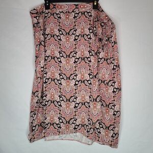 20W Boho Pink Paisley Wrap Skirt Midi Lightweight Maurices NWT, plussize, flowy woven fabric, inside button closure with tie waist, high rise, mid length, unlined. Measurements approximately waist to hem 31" waist across 22" band width 1.5" weight 12oz