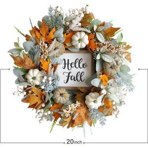 20inch Thanksgiving Fall Wreath, Eucalyptus Berries Pumpkins Lamb Ears Leaves
