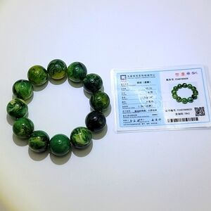 Very beautiful multi colored green, yellow and white beeswax amber stretch bracelet with 20mm amber beads. Will fit a 7" wrist comfortably. Has UV reaction. Comes with Certified Certificate of Authenticity Card from the Jade and Jewelry Inspection Center. See the Google translated information.
