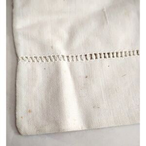 Antique Vintage White Linen Pouch, approx. 8 by 8 inches. Delicate handwork with open hemstitching and crochet trim at top, drawstring closure. Shows age with light spots and edge seam separation, but full of charm.