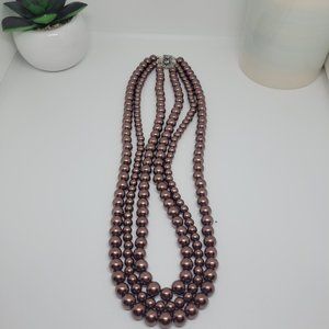 21" (3) Strand Glistening Cocoa Glass Pearl Necklace with Filigree Box Clasp. This necklace glistens a beautiful chocolate color. The box clasp is a favorite and so classy. We hope you enjoy it!