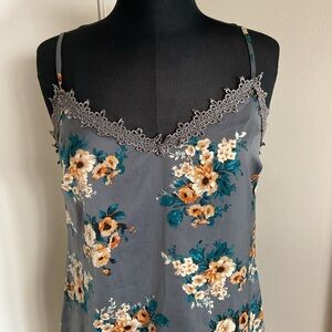 This elegant slip dress by Honey Punch features a sleeveless design with spaghetti straps, perfect for a night out. The dress showcases a sophisticated floral pattern in orange and white against a dark gray background, complemented by green foliage accents. Its mini length and fitted silhouette offer a chic and modern look.
