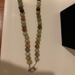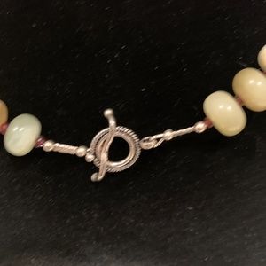 21" inch earth-tone natural stone necklace with garnet spacer beads and sterling silver toggle clasp. Unique handmade design.