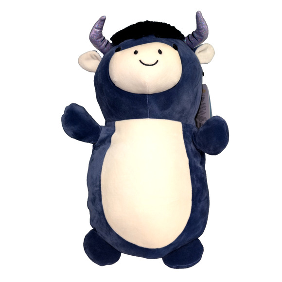 The 21" Perni Blue Highland Cow Bull Squishmallows Hug Mees Plush Stuffed Animal is a medium-sized plush toy from the Squishmallows character family by Kellytoy. With a cute blue color and realistic bull design, this cuddly stuffed animal is perfect for children who love animals and plush toys. Its huggable nature makes it an ideal companion for playtime or naptime. This adorable plush will surely bring joy and comfort to any child's playroom or bedroom.