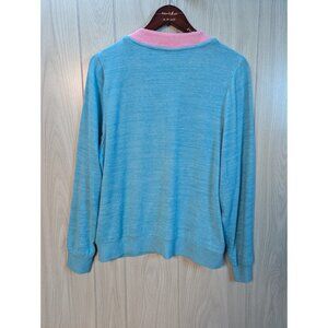 The product is a stylish teal blue and pink XL cardigan by the brand Twenty One Pilots. It is a sweater made from a blend of polyester, spandex, and rayon, designed for women who prefer a regular size fit. The cardigan features a unique trident design, making it a trendy and eye-catching addition to any wardrobe. Perfect for those looking for a fashionable and comfortable piece to stay warm in style.