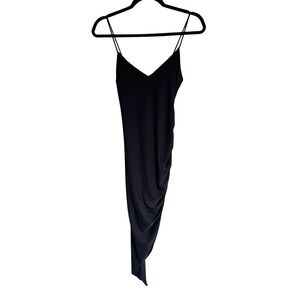 Spaghetti strap v neck bodycon asymmetrical dress with side ruching. Stretchy and soft, fully lined. The perfect little black dress for any occasion.