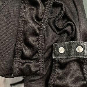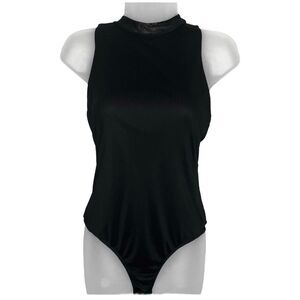 Size Medium. Color is black. Mesh bodysuit, mock neck, sleeveless, double snap.
