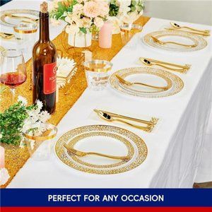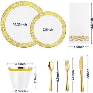 🧿PREMIUM QUALITY & REUSABLE: The heavyweight plastic dinnerware set is the best quality you will find in plastic dinnerware. The gold plastic plates are strong enough to hold a full plate of food while sitting or standing. The gold disposable cutlery has extra thick handles and the fork and knife are strong enough, and you can even wipe it clean after use for the next use.