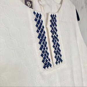 - Crewneck w/ blue embellishments at neckline slit (center chest)