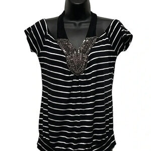 Bebe Y2K Bead Embellished Halter Cap Sleeve Black White Striped Women’s Top XS