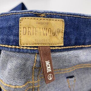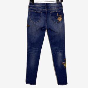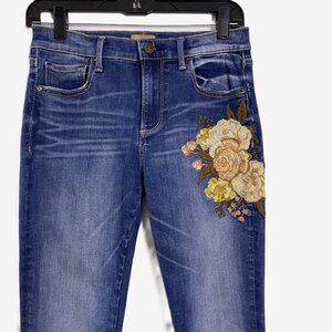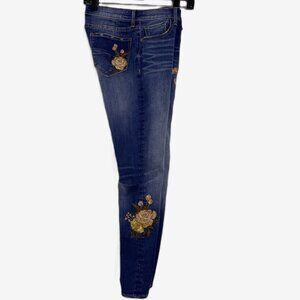 Driftwood Jackie Floral Embroidered Jeans. Classic skinny fit with stretch. 5-pockets. Intricate embroidered floral at the left hip, right back pocket and right knee. In good used condition, no flaws.