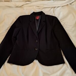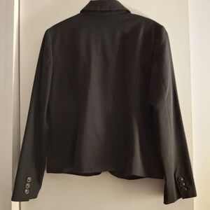 This classic black fully satin lined cropped blazer from 212 Collection features a tailored fit with structured shoulders and a professional business-style cut. Its timeless design makes it a versatile addition to any wardrobe, perfect for formal occasions or professional settings. Size 10P. pit to pit measures 18 inches. Length 22 inches.