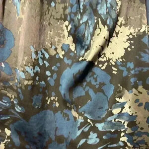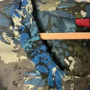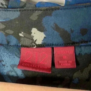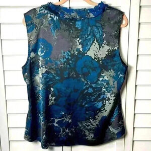 Beautiful top with black, grays and a multitude of blues. 97% polyester 3% spandex. Machine washable. Smoke free home. Orders shipped next business day.
