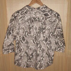 212 Collection snake print button down 3/4 sleeve shirt large. Like new condition! Measurements are 21 1/2" from armpit to armpit, 13 1/2" from armpit to hem, 24" from shoulder to hem, and 18" sleeve.