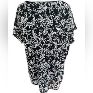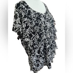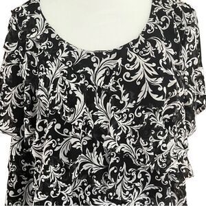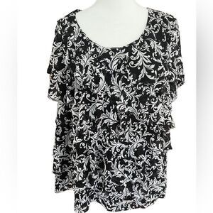 212 Collection black & white short sleeved tiered ruffle front top, size 2X.