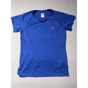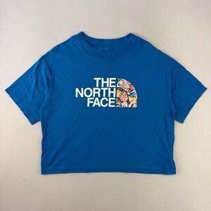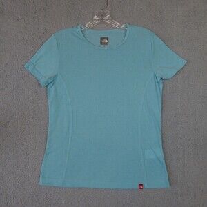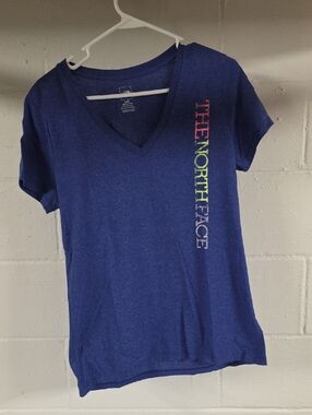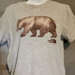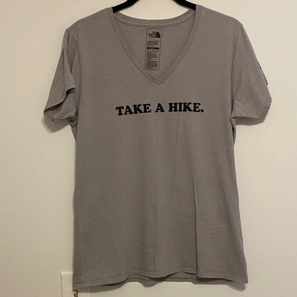 Classic V-neck tee from The North Face. Center front 'TAKE A HIKE.' printed in bold. Soft-looking light gray fabric with short sleeves. Simple, casual style for everyday wear.