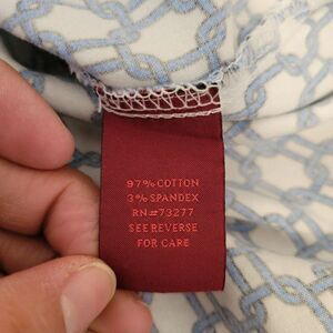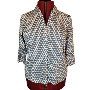 Beautiful blue and white colors, geometric pattern, collar, button up closure, 3/4 sleeves, stretchy and comfortable. Perfect for work or casual settngs. This would look great with jeans or slacks.
