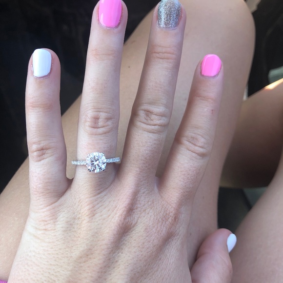 A round brilliant-cut Kobelli Moissanite and lab grown diamonds line this classic bridal rings set in solid 14-karat gold. The center stone is an 8 mm (1.9 carat) moissanite gemstone, similarly created in a lab like the lab-grown diamonds set beside it. The prong set stones are all round brilliant-cut to best showcase the beautiful sparkles. With the diamonds graded at an illuminating DEF color and VS clarity, this pairing leaves no detail of eye-catching refinement behind. The moissanite and diamonds alike are eco-friendly and responsibly grown. The diamonds rank at the top of the diamond hierarchy with its unclouded cores and perfectly cut facets while the moissanite showcases its famed firey brilliance.