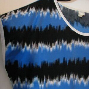 Exit tunic in size XL. Blue and black in a vibrant pattern on this tunic blouse. Scoop neckline and short sleeves. Silky feeling material, made from 95% polyester and 5% spandex, machine wash.