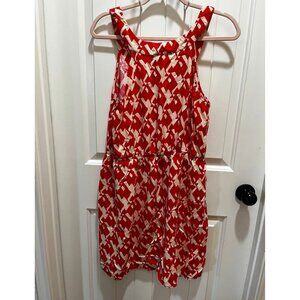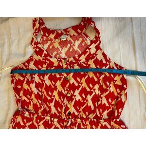 - Red and off white patterned knee length dress. 4 faux silver buttons down middle of chest. Drawstring waist gives lots of stretch.