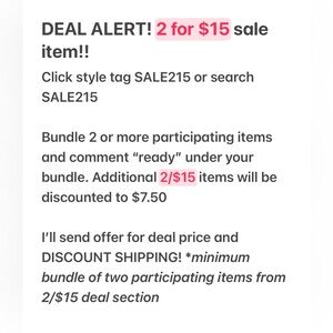 I’ll send offer for deal price and DISCOUNT SHIPPING! *minimum bundle of two participating items from 2/$15 deal section