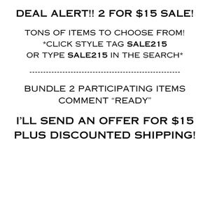 DEAL ALERT! Check out this awesome SALE! BUNDLE THIS ITEM WITH ANOTHER 2/$15 ITEM IN MY CLOSET, COMMENT “READY” AND I’LL SEND $15 OFFER WITH DISCOUNTED SHIPPING!!! There are tons of participating items to choose from! To find these items, type SALE215 in the search bar on Poshmark or click the SALE215 style tag on this inventory