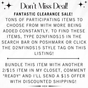 Tons of participating items to choose from with more being added constantly. To find these items, type d2nfinds15 in the search bar on Poshmark or click the d2nfinds15 style tag on this listing!