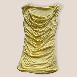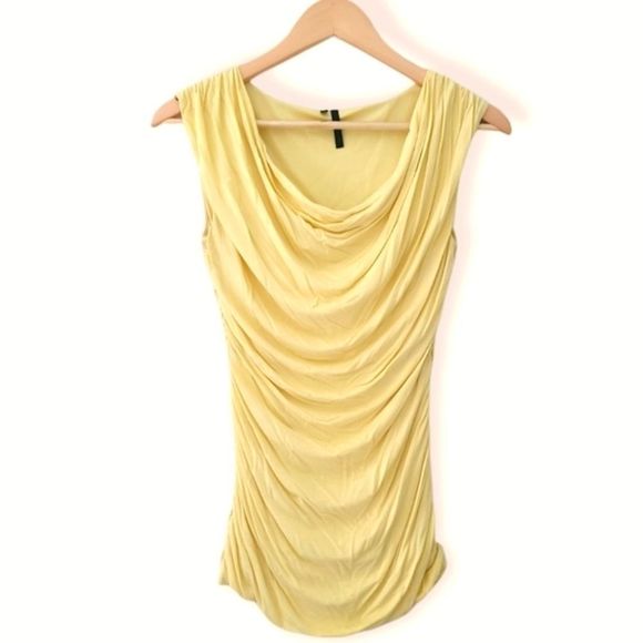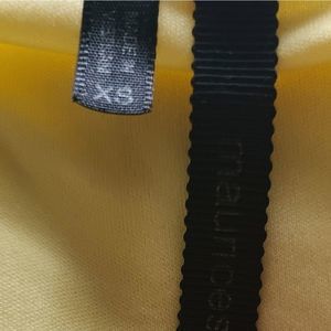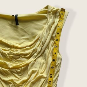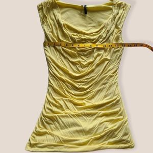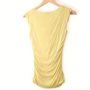 Super soft pastel yellow sleeveless top from Maurices. Form fitting. Please note light stretch marks on the back and light spots on the front (they're hard to see even when looking for them; I had to look 3 times to find it). Most accurate color depicted in the stack for comparison