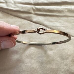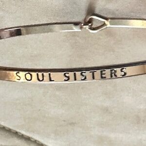 2/$15 Rose gold tone & silver tone dainty bangle bracelet with “Soul Sisters“ inscribed on bottom. Outside of bracelet looks like a rose gold tone & bottom outside “SOUL SISTERS” is engraved. Inside of bracelet looks like a silver tone. 2.5” x 2”. Unique clasp, open teardrop on one side & bead hook on other side that slips into opening. Easy to take on & off by yourself. Excellent condition. No marks, stamps or signatures other than notated above.