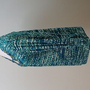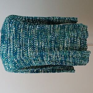 Rayon and spandex blend, pullover top in pretty print of teal, aqua and white. Beaded/ jeweled neckline, 3/4 sleeves. EUC.Smoke free pet free home.