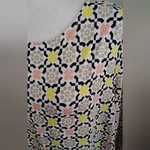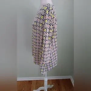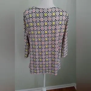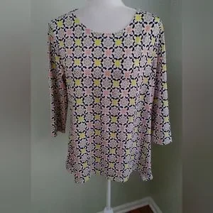 Stretchy polyester spandex, 3/4 length sleeve pullover top, floral/ medallion print in peach, yellow, beige and black on a white background. EUC. Smoke free pet free home