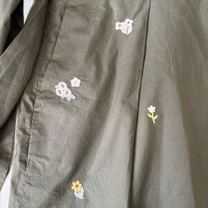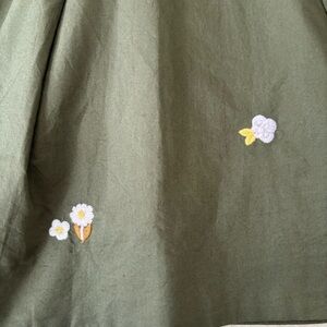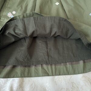 This cute little skirt has small floral embroidery of pastels, white, yellow, blue and pink on an olive green background. It has a tie at waist which could be tied on the side as shown or front. There is an invisible back zipper with hook and eye closure. Skirt is completely lined and has two functional slant pockets in the front. Fabric content of skirt and lining is 100% cotton, easy care, machine wash and dry. Measurements are length 17 inches and waistband approximately 26 inches.