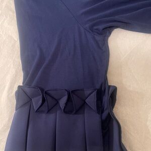 This navy blue top features a beautiful three quarter sleeve with a pleated ruffle. It is an easy care fabric that is machine/dryer washable. It is more loosely fitted. Measurements are top to bottom 30 1/2”, sleeves 19” and pit to pit 25”.