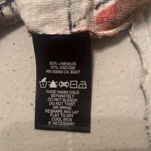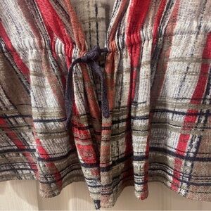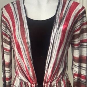 This festively striped cardigan is a lightweight linen-blend fabric. A drawstring tie front gives flattering definition to the fit. Front tie closure with long sleeves. Fabric is 63% linen, 37% viscose. Beautiful color combination of reds, black, olive and white. In very good pre-owned condition. Measurements are top to bottom 23”, pit to pit lying fat appropriately 17” and top of neck to bottom of sleeves 23”.