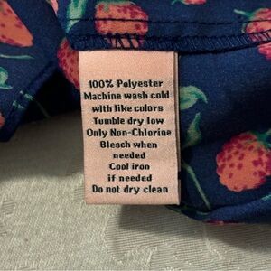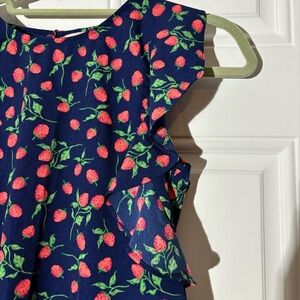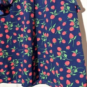 This is a lightweight sleeveless top with a flutter sleeve. It’s a strawberry print on a navy blue background. Fabric content is 100% polyester, easy care machine wash and dry. Measurements are 23.5 inches and pit to pit 17 inches.