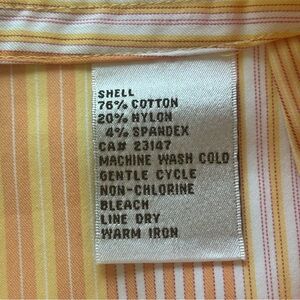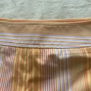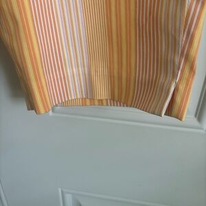 These lightweight capris look like summer with the horizontal stripes of yellow, orange, white and pink. They have a 2 inch waistband and a 5.5 inch invisible side zipper with a button closure. Fabric content is 76% cotton, 20% nylon and 4% spandex, machine wash. Measurements are length 30 inches, inseam 19.5 inches, waistband approximately 29 inches and bottom of leg 8 inches with a 1.25 inch opening.