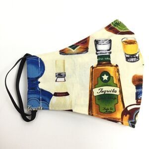 1/$10 or bundle 2/$15! Handmade 3-layer face mask (2 fabric, 1 removable filter). Cream pre-shrunk cotton fabric w/tequila bottles. Adult Size. Nose slot has a removable pipe cleaner for snugger fit. Includes filter pocket in back. 1 "Filti fabric" filter is included & can be inserted into pocket if desired. Remove pipe cleaner & filter before washing! 7” elastic ear loops. *Masks are not medical-grade & take 1 hour to create. **EACH MASK LOOKS DIFFERENT DEPENDING ON PLACEMENT ON FABRIC. #liquor #reposado #agave #blanco #crossbones