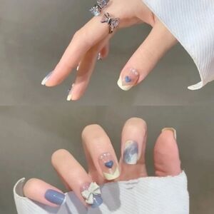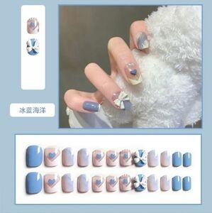 Style - 3D Bows & Hearts French Manicure Nails - Blue & White