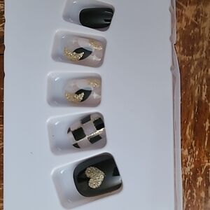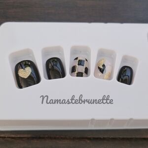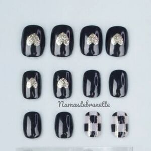 Style - Glittering Hearts Checkerboard Pattern Nails - Black, Gold, and White