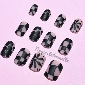 2/$16 Black Matte Floral Checkerboard Press On Nails
