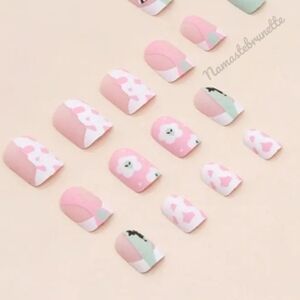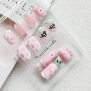 Short Nails | Floral Alien Cow Pattern Nails | Square Nails | Fake Nails | False Nails | Press Ons | Summer Nails | Beach Nails | Pink Green Black White | Manicure | Y2K | Summer | Spring | Rhinestone