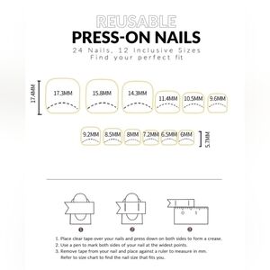 Quantity - Set of 24 nails in sizes tiny to large! This means no need to size your nails before purchase! 1 file and 1 adhesive strips.
